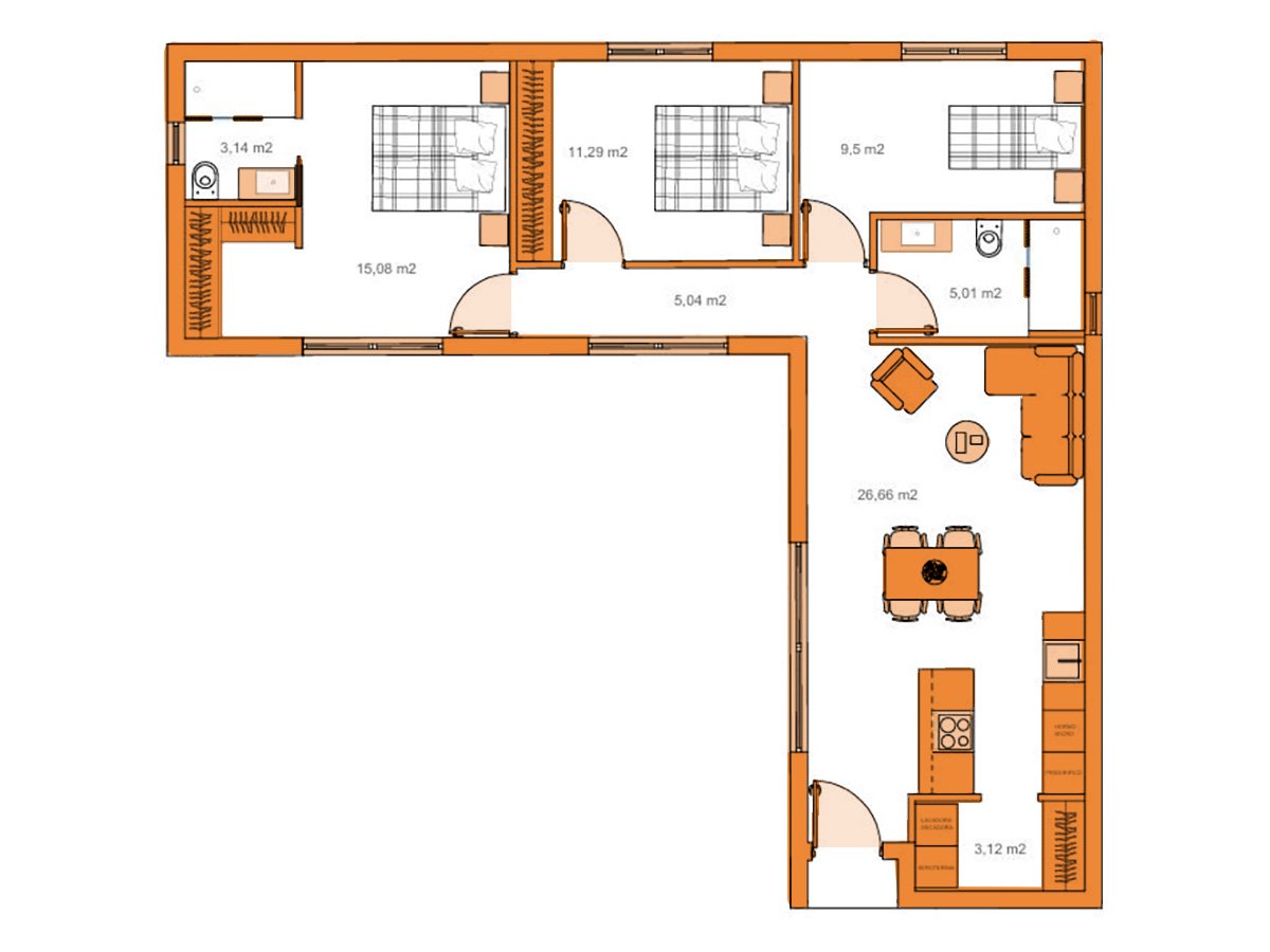 El espacio principal lo forma un salón con cocina integrada amplio y luminoso, diseñado para concentrar la vida diaria en un ambiente cómodo, funcional y abierto al exterior.