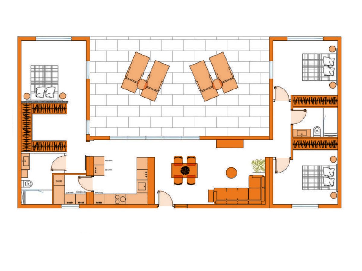 El Modelo LEDICIA nace de la idea de convertir el jardín y la terraza en el eje de la vida cotidiana. Su planta organiza los espacios en torno a una gran terraza central que actúa como sala exterior: los grandes ventanales y los accesos directos desde el salón y la cocina borran la frontera entre interior y exterior y maximizan la entrada de luz natural. El resultado es una vivienda que se percibe amplia, luminosa y respirable desde cualquier punto.